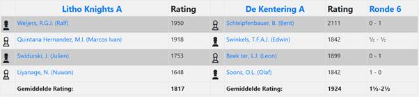 Zelf behaalde ik een regelmatige overwinning. In het vervolg zal ik de partij bespreken. Bart, aan bord een, was de partij goed begonnen, maar in het middenspel wisselden de kansen. Bart accepteerde het remiseaanbod van zijn tegenstander in het besef dat we daarmee de wedstrijd hadden gewonnen.