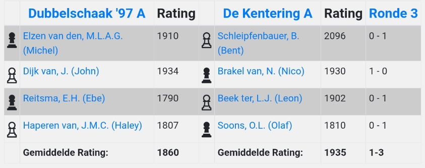 Daarmee traden teams van onze clubs aan die ongeveer gelijk waren in speelsterkte op papier. Het werd dan ook daverend spannend. Misschien nog het minst in de match van team 3. Daar zag het er in de loop van de middag als snel heel gunstig uit op de meeste borden, en kon De Kentering 3 de sterke start van het seizoen doortrekken met een fraaie 3-1 overwinning.