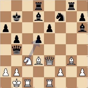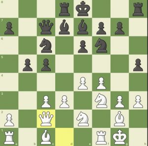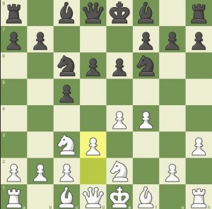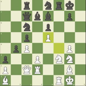 6… h5 7. g3 Le7 8. Lg2 d5 9 0-0 d4 10. Pb1 Ld7 11. Pd2 Dc7 12. Pf3 Td8 13. c3 dxc3 14. bxc3 b5 Dc2 ….(Diagram 2)