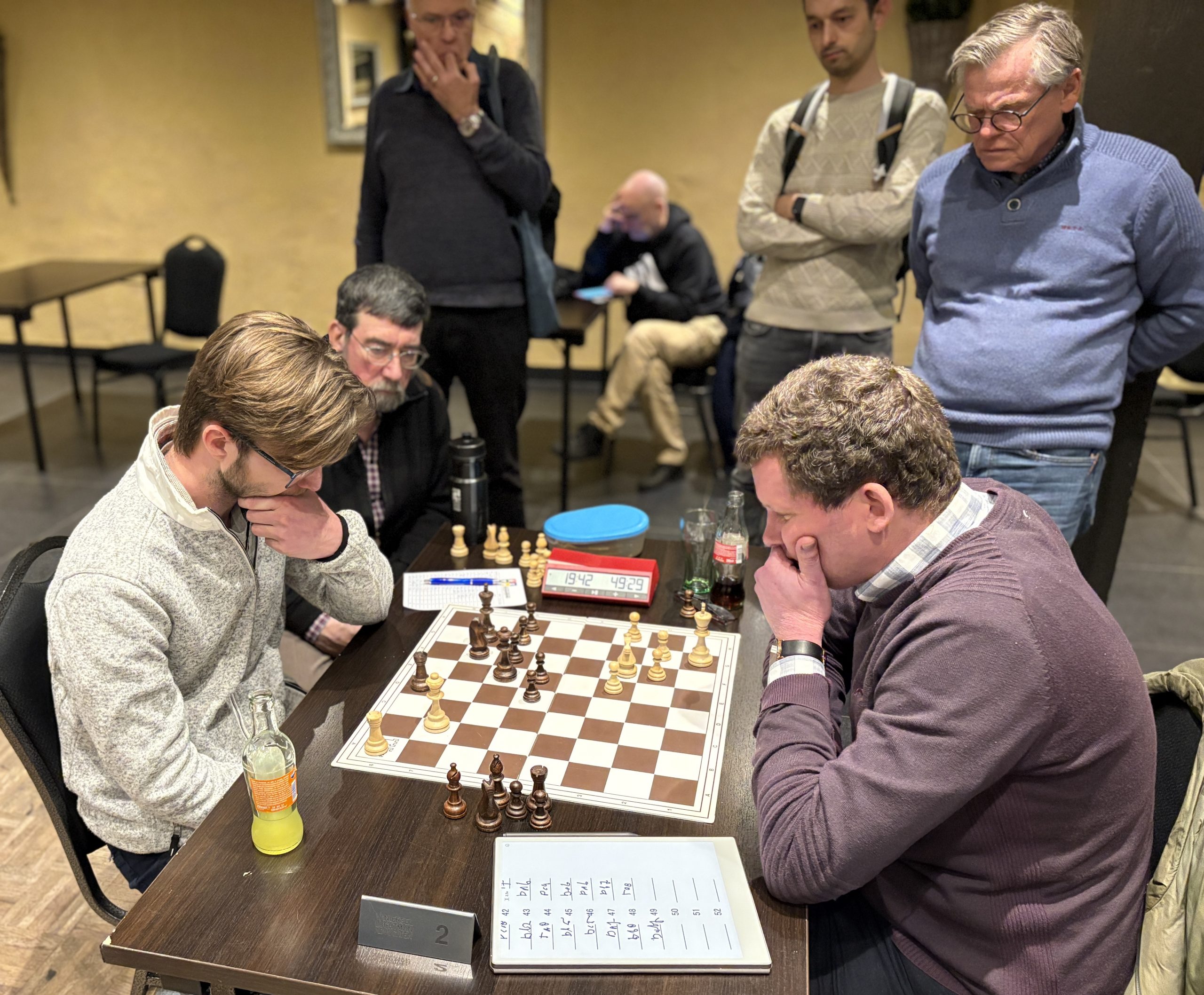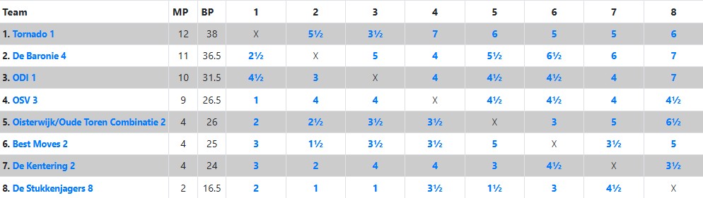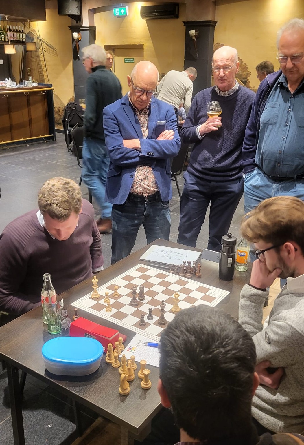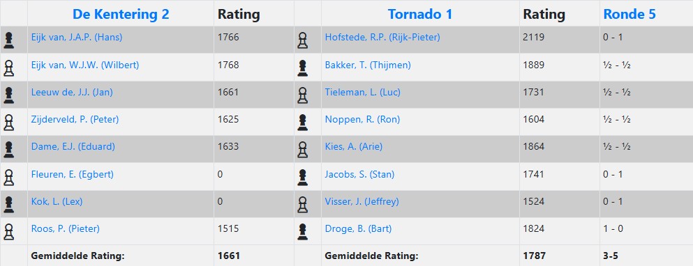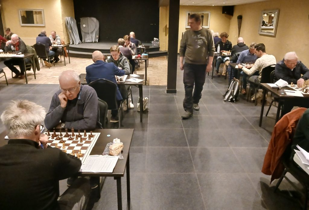 Heel anders dan in de wedstrijd tegen Baronie 3 stonden we halverwege de middag in deze wedstrijd op veel borden goed, of in het geval van Ralf op zijn minst kansrijk in zijn agressieve Italiaanse opzet tegen Nico Schellingerhout. Zijn tegenstander gebruikte zeeën van tijd om de complicaties te doorgronden, waarin Ralf veel vertrouwder is. Dat lukte hem uiteindelijk vrij goed en na enkele onnauwkeurigheden ontstond een stelling waarin Ralf een kwaliteit had tegen 3 pionnen. Die bleken te lastig om tegen te houden. Leon dacht na een geblunderde pion in de opening al aan opgeven, zag tot zijn verbazing dat zijn opponent Kiran Anginthaya in diep gepeins verzonk, en ontdekte na nadere bestudering van de stelling dat hij toch ook heel behoorlijke compensatie had, zeker toen zwart niet op z’n sterkst vervolgde. Opgelucht accepteerde Leon de wat later aangeboden remise, om later te ontdekken dat hij inmiddels eigenlijk al beter stond in de slotstelling. Na de snelle remises van Ton en Edwin, stond het na 1,5 uur spelen 1,5 – 2,5, maar op de vier overige borden was de situatie ronduit positief. Piet won als eerste zijn partij, die hij hieronder bespreekt. Zelf kwam ik met geduldig spel steeds beter en rondde af met een kwaliteitsoffer die promotie onafwendbaar maakte (zie onderstaande analyse). En ook in de laatste twee partijen waren er plussen. Daar werkte de vele jaren schaakervaring van Tom en Nico in hun voordeel. In stellingen die zich naar mijn indruk eerst nog binnen remisemarges bevonden, won de eindspelkunde van onze spelers. Op mijn opmerking tegen Ton dat de partij van Nico nog enigszins gelijk leek, zei Ton veelbetekenend: Ja, dus wint Nico.