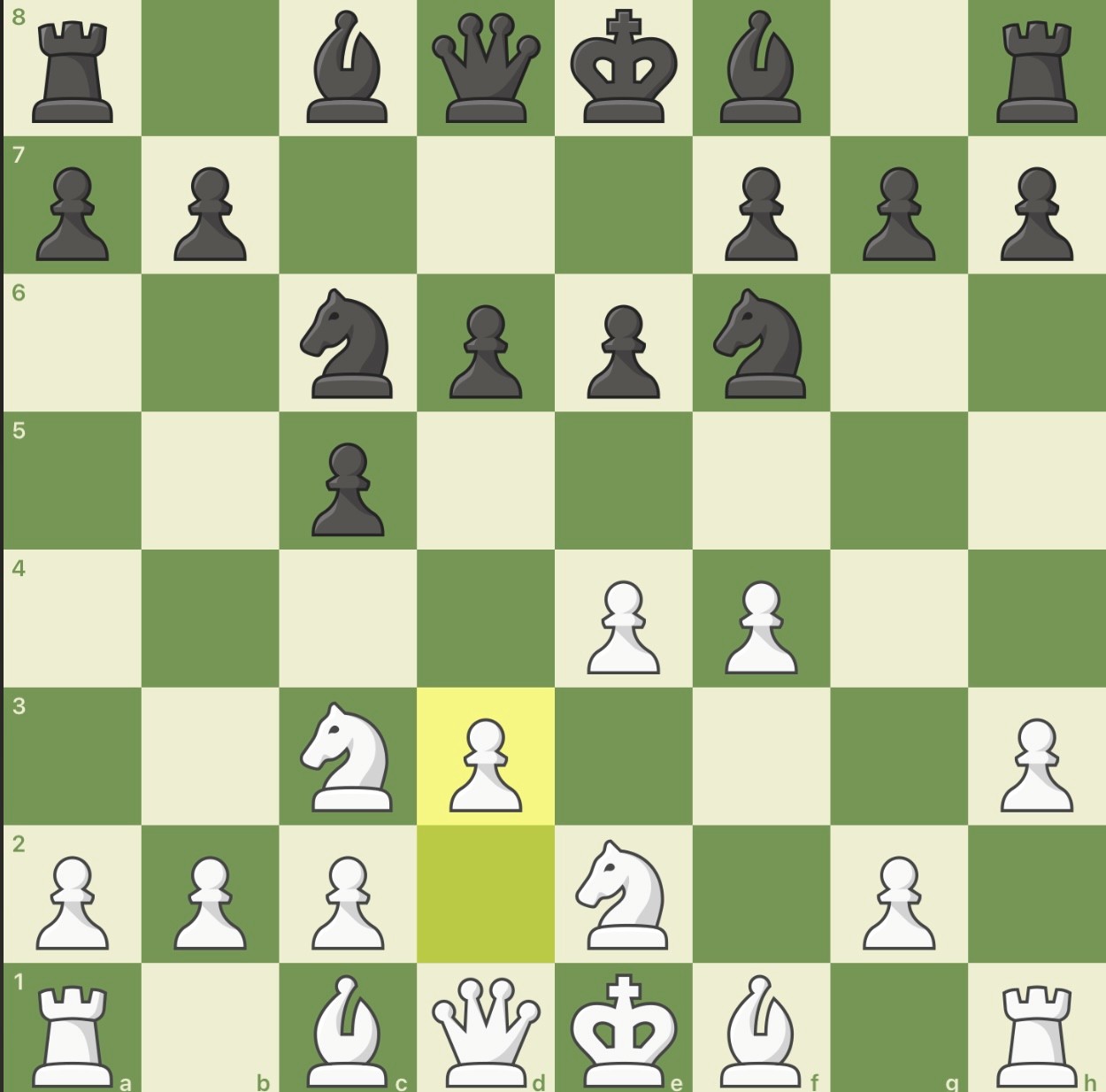 1. e4 c5 2. Pc3 Pc6 3. Pe2 Pf6 4. f4 d6 5. h3 e6 6. d3 … (Diagram 1)