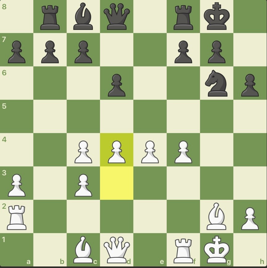 1. c4 e5. 2. Pc3 Pf6 3. g3 Pc6 4. Lg2 Lc5 5. Pa4 Le7 6. Pf3 0-0 7. 0-0 h6. Een behoudende zet gaf mijn tegenstander na afloop aan. Waarschijnlijk is het actieve d5 beter. 8. d3 Ph7 9. a3 Een opmaat voor een mogelijke opmars op de damevleugel, maar naar later blijkt ook nuttig om ruimte te maken voor verplaatsing van de toren via de tweede rij naar de koningsvleugel. 9. …. Pg5 10. Pc3 d6 11. Pxg5 Lxg5 Chess.com geeft aan nu de lopers af te wikkelen en met b4 op de damevleugel op te trekken. Ik besloot de pionnenstructuur op de koningsvleugel te (laten) verzwakken en met een versterkt pionnencentrum de zwarte koningsvleugel aan te vallen. Ik speelde f4. 12. f4 exf4 13. gxf4 Lf6 14. e3 Lxc3 Zwart slaat het paard dat een sterke positie heeft en bezorgt wit een dubbelpion, maar wel ten koste van zijn loperpaar. 15. bxc3 Pe7 16. e4 Vanaf nu blijft zwart te passief ten opzichte van het sterke, oprukkende centrum van wit. Een zet als f5 was wenselijk geweest. 16. … Pg6 17. Ta2 Hier was nog steeds f5 geboden. En wit had dat overigens moeten voorkomen door direct f5 te spelen in plaats van Ta2. 17. … Tb8. 18. d4