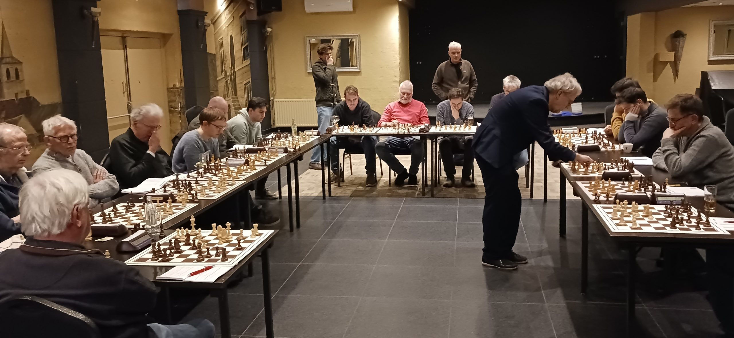 We werden ontvangen in een prachtige locatie: de oude pastorie van de Sint-Laurentiuskerk. Niet alle ruimtes waren verwarmd, dus moesten we een enkele keer verkassen. In de ruimte waar we uiteindelijk zouden spelen, was de temperatuur nog niet helemaal op orde. Dat had een reden: de radiators waren nog niet geactiveerd. Peter Stokkermans, collega-teamcaptain van DSC, had het heel druk met de interne competitie die ook gespeeld werd. Maar er was uitkomst: ons eigen Peter, véél ervaring met technische installaties, zorgde dat de thermostaatknoppen de goede kant op wezen. Binnen de kortste tijd was het aangenaam vertoeven in de speellocatie.