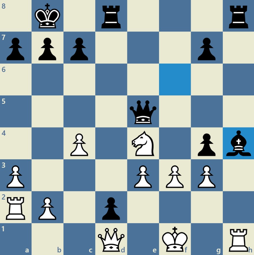 We beginnen met de eerste schaakopgave. Zwart is aan zet. Welke zet moet zwart in stelling 1 spelen en wie trekt aan het langste eind?