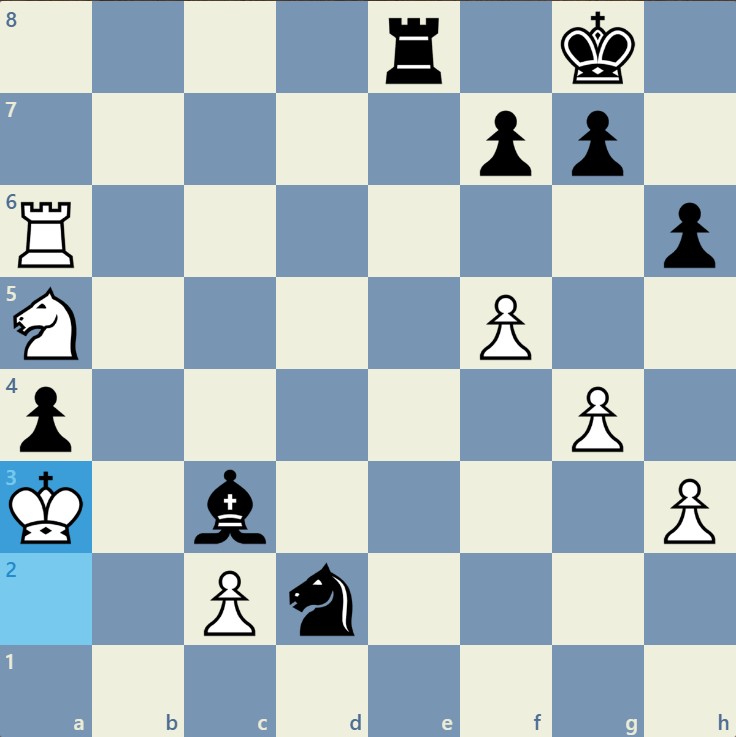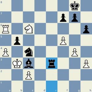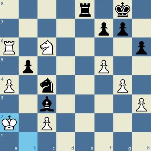 In deze stelling speelt Alireza de beste zet 32… Pd2. En na Luke’s antwoord 33. axb4 is na 34. Te1! mat op a1 onvermijdelijk. Paard en loper werken prachtig samen om de koning alle vluchtvelden te ontnemen.