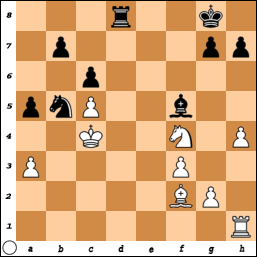 Op het schaakbord zijn we alweer aan de tiende opgave toe. In de volgende stelling heeft Kloza met zwart zojuist met Lf8-c5 de witte loper op d4 gepend. Dit loste echter zijn problemen niet op. Hoe beslist wit de partij (stelling 10)?