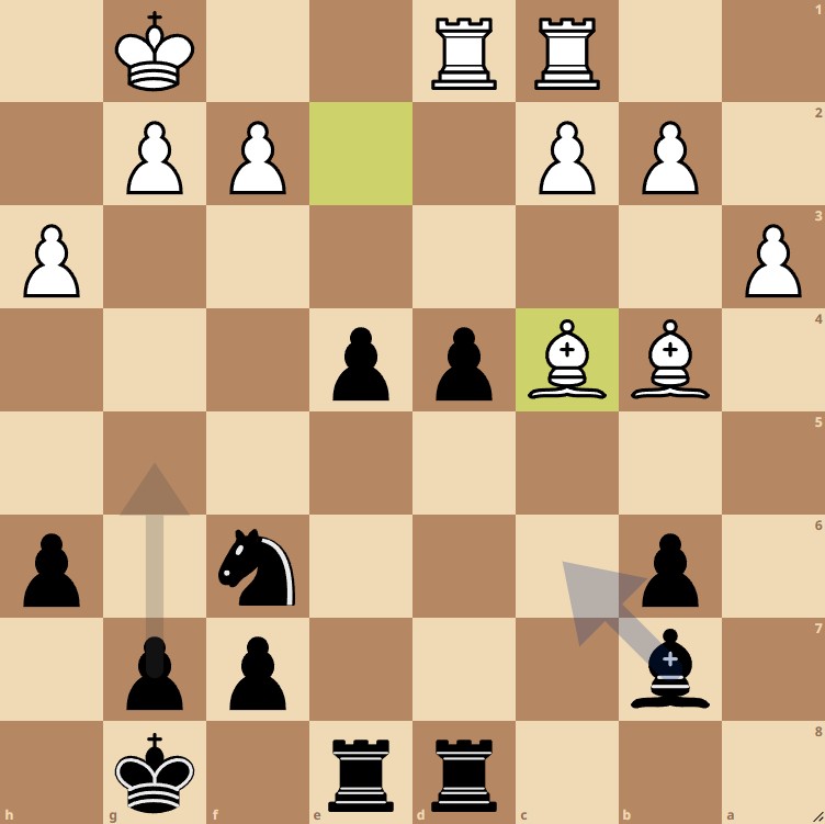 Ik heb inmiddels drie verbonden vrijpionnen op de koningsvleugel, en moet beslissen waar ik mijn loper zal plaatsen. Lh5 om f7 te verdedigen? Niet nodig. f7 is voldoende gedekt door toren en koning en de loper staat de opmars van de h-pion in de weg. Ld5? Geeft de voorsprong weg omdat na Lxd5 Txd5 b4! wit plotseling ook met zijn c-pion aan een opmars kan beginnen. Na Lb2 (a1) heeft wit ook nog tegenspel met b4, a4, etc. Dus: 34.. Lc6! Houdt zowel het promotieveld h1 in het vizier als veld a4, en de opmars van de h-pion kan van start.