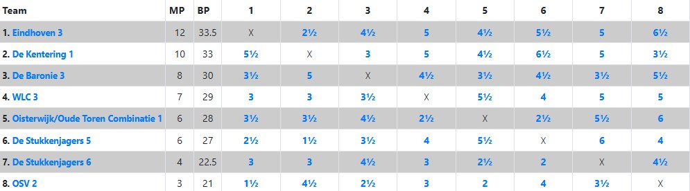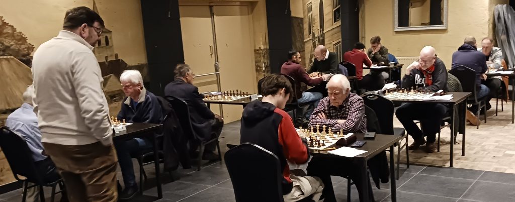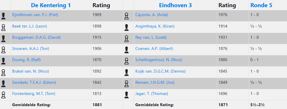 Heel anders dan in de wedstrijd tegen Baronie 3 stonden we halverwege de middag in deze wedstrijd op veel borden goed, of in het geval van Ralf op zijn minst kansrijk in zijn agressieve Italiaanse opzet tegen Nico Schellingerhout. Zijn tegenstander gebruikte zeeën van tijd om de complicaties te doorgronden, waarin Ralf veel vertrouwder is. Dat lukte uiteindelijk vrij goed en na enkele onnauwkeurigheden ontstond een stelling waarin Ralf een kwaliteit had tegen 3 pionnen. Die bleek te lastig om tegen te houden. Leon dacht na een geblunderde pion in de opening al aan opgeven, zag tot zijn verbazing dat zijn opponent Kiran Anginthaya in diep gepeins verzonk, en ook Leon ontdekte na nader bestudering van de stelling dat hij toch ook heel behoorlijke compensatie had, zeker toen zwart niet op z’n sterkst vervolgde. Opgelucht accepteerde Leon de wat later aangeboden remise, om later te ontdekken dat hij inmiddels eigenlijk al beter stond in de slotstelling. Na de snelle remises van Ton en Edwin, stond het na 1,5 uur spelen 1,5-2,5, maar op de vier overige borden was de situatie ronduit positief. Piet won als eerste zijn partij, die hij hieronder bespreekt. Zelf kwam ik met geduldig spel steeds beter en ronde af met een kwaliteitsoffer die promotie onafwendbaar maakte (zie onderstaande analyse) en ook in de laatste twee partijen waren er plussen. Daar werkte de vele jaren schaakervaring van Tom en Nico in ons voordeel. In stellingen die naar mijn indruk zich eerst nog binnen remisemarges bevonden, won de eindspelkunde van onze spelers. Op mijn opmerking tegen Ton dat de partij van Nico nog enigszins gelijk leek, zei Ton veelbetekenend: Ja, dus wint Nico.