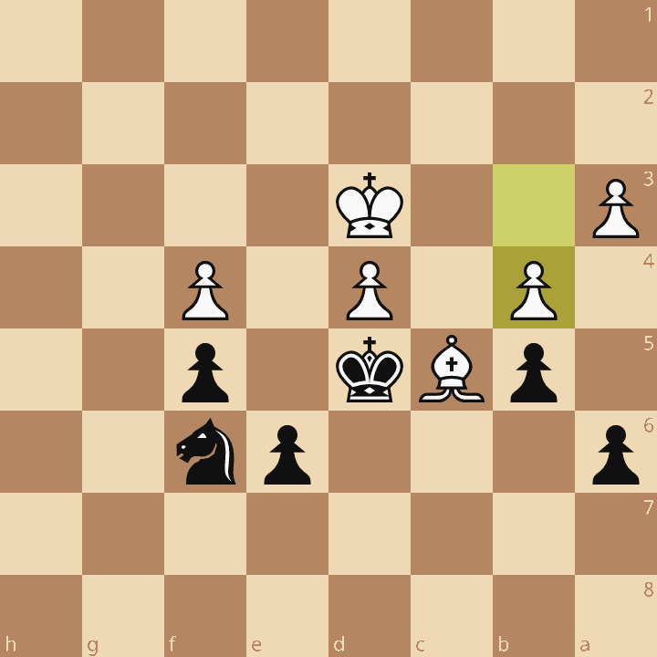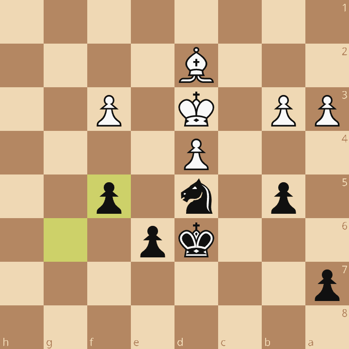 Hoe dan ook, na 39. f4 maakt wit het niet makkelijker voor zichzelf omdat deze pion een doelwit voor mijn paard wordt. Na 39…Pf6 40. Lb4+ Kd5 staat mijn koning op het ideale blokkeerveld en is mijn paard vrij om moeilijkheden te veroorzaken in het kamp van mijn tegenstander. Na 41. Lc5 a6 bleek mijn tegenstander de beslissende fout 42. b4 te begaan. Zie diagram 2