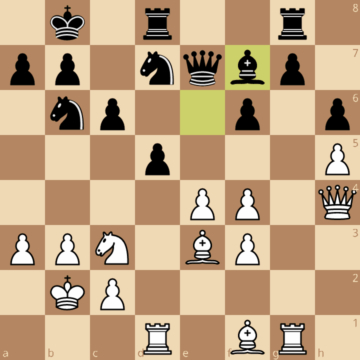 Stelling na 22. … Lf7. Zwart heeft vooral last van zijn eigen stukken. Paard op d7 is gebonden aan Paard op b6, maar blokkeert gelijk de toren op d8.