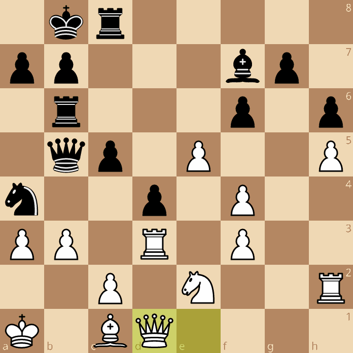 Stelling na 32. De1-d1. Zwart’s stukken staan aanvallend opgesteld, maar wit lijkt nog net genoeg defensieve krachten rondom de koning te hebben.