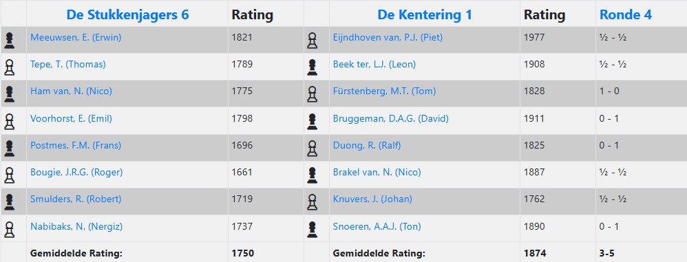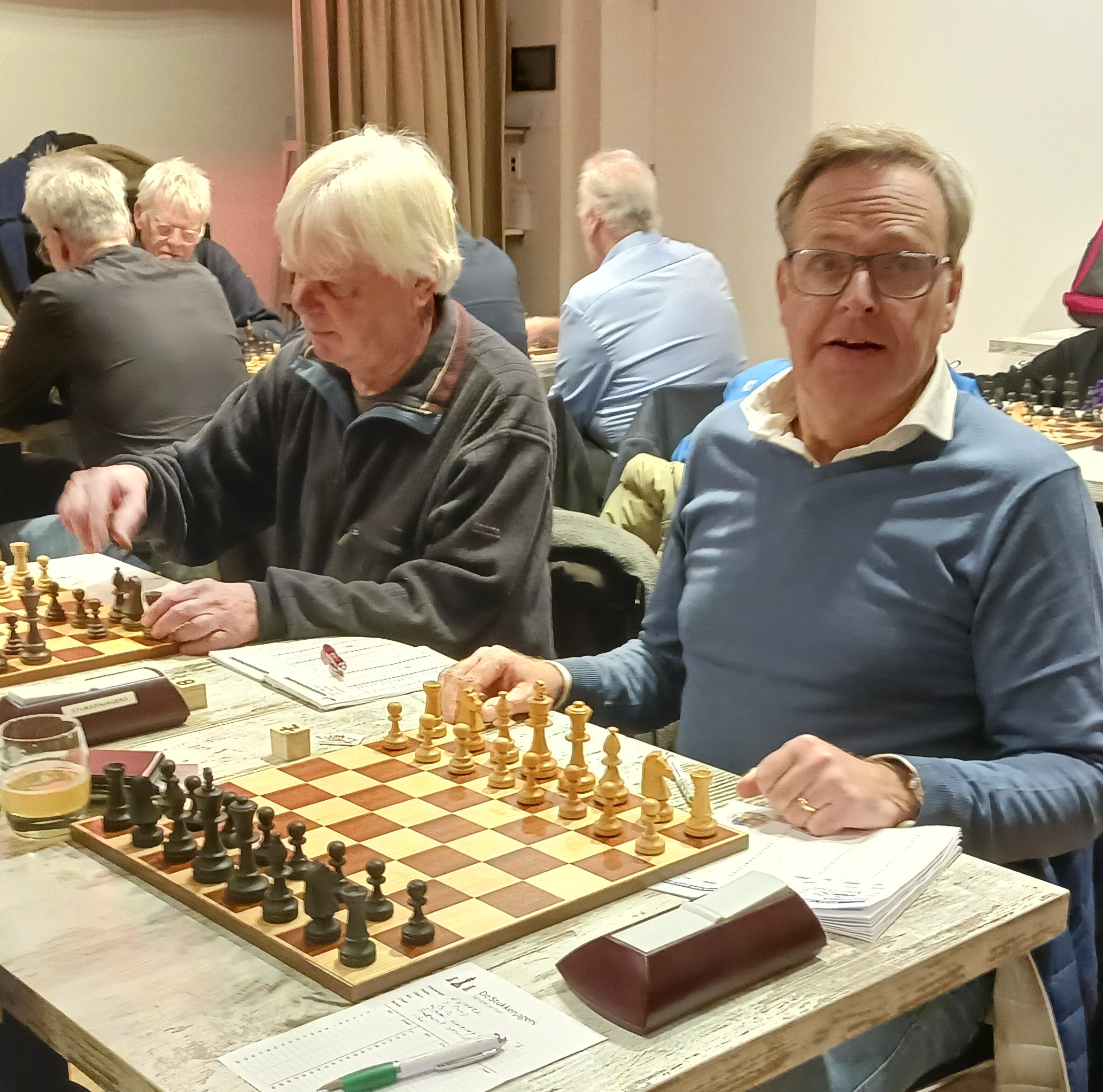 Maar dat is dan het fijne van zo’n teamwedstrijd. Je ziet bij meerderen twijfels, zoals bijvoorbeeld bij Leon: “Ik sta iets beter, maar met nog drie minuten op de klok durfde ik niet door te spelen en voor de winst te gaan”. En bij Tom: “Jammer. Ik stond compleet gewonnen” (was ook zo!). Maar doortastend optreden van teamgenoten – Ton en Ralf behaalden mooie strakke overwinningen – of gewoon het altijd opbeurende optimisme van Johan, die zowaar een remise uit een dramatische stelling sleept, trekken het team erdoor. Fijn, die teamspirit en elkaars twijfels opvangen met het samen knokken voor de overwinning!