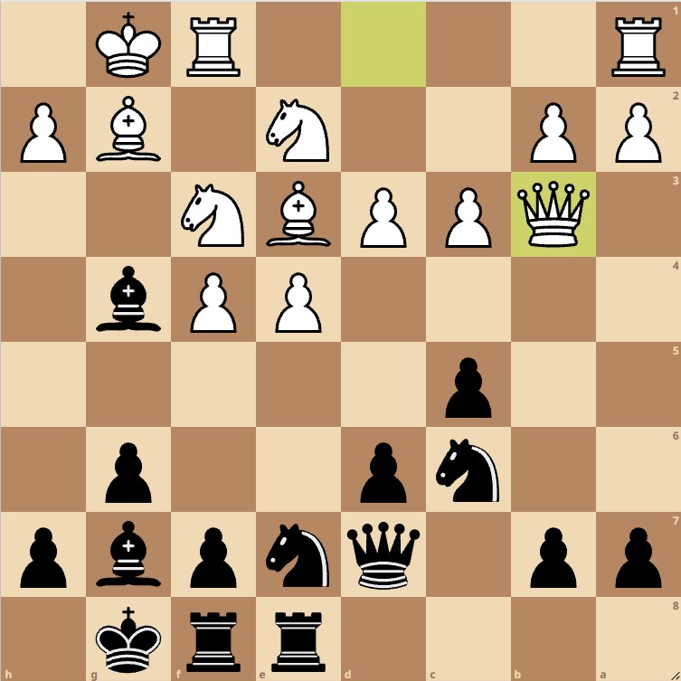 12… Tae8 13. Db3 (Stelling 3) David: Niet de sterkste zet. Ik vind de dame daar wat buitenspel staan en de lichte stukken op de e-lijn staan daar wel erg ongedekt nu. Sven: Mee eens, ik wilde mijn dame ontwikkelen maar onderschatte de kracht van Tae8. Dd2 is simpel maar veel sterker. 13… Kh8 David: Het automatisme 13. Kh8 speelde ik a-tempo. Volgens de computer was ook direct Pf5 goed, maar ik aasde erop de f-lijn open te maken voor mijn toren om alle stukken in de aanval te betrekken.