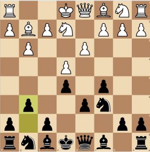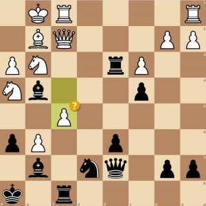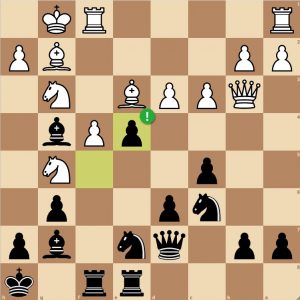 14. Ng3 f5 15. Ng5 David: Ziet er gevaarlijker uit dan het is. 15… fxe4! (Stelling 4) David: De loper op g5 dekt nu weer mooi het veld d6 af en 16. Pf7+ kan niet, omdat dan Txf7+! volgt en na 17. Dxf7 Ld6! met damewinst! 16. dxe4 h6 David: De computer noemt: 16… Pa5 17. Dc2 Pc4 als nog betere voortzetting. Niet gezien. 17. Pf3.