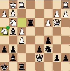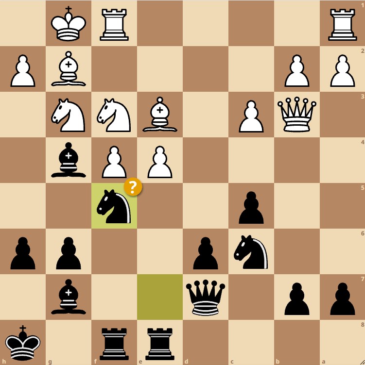 26… Lf6?? David: Zonde, valt het verkeerde paard aan! Na 26. Le5! moet wit alle zeilen bijzetten om zich te verdedigen.
