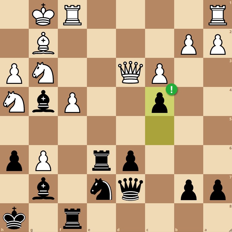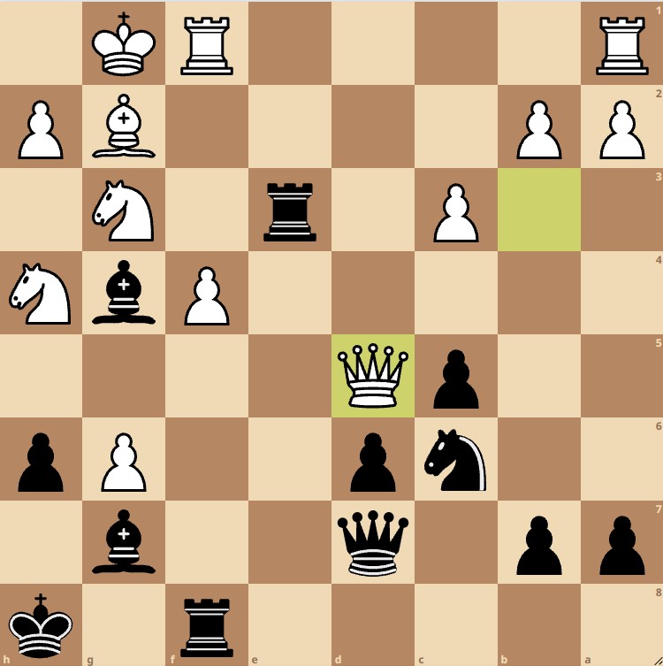 Sven: Dd3 is een multifunctionele damezet die zowel de pion op g6 dekt als Te3 voorkomt, alleen speelt David de zeer sterke c4 die ik eigenlijk niet kan slaan en waardoor ik Te3 alsnog moet toestaan. 23… c4! (Stelling 8) 24. Dc2 Te3 25. Df2 Td3