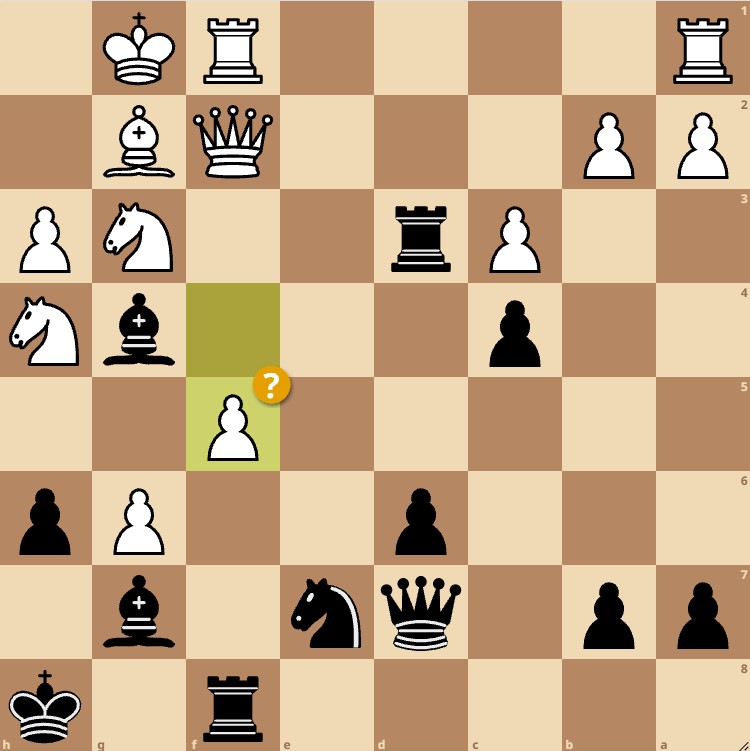 26. f5?(Stelling 9) Sven: zag hier enorm veel leuke trucjes na f5 maar de kracht van 26… Le5 onderschat. Had het hier gewoon simpel moeten houden door zijn loper te slaan met mijn pion. De computer vind hier overigens 26. Tae1 compleet winnend maar dat lijkt me geen realistische zet op ons niveau, ik heb deze zet in ieder geval niet eens overwogen hehe…