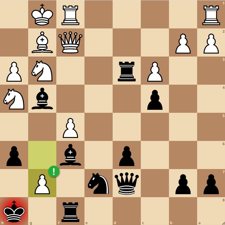 35. Pg6+ (Slotstelling) David: wint de partij definitief. Slaan met de toren helpt niet; pion g4 staat gedekt en met de gecombineerde dreigingen van Dd4+ en Tf7 is het na een paar zetten mat. Mooi gespeeld met een goed ook voor combinaties in de stelling. Sven: Pg6+ is nog maar eens een leuk trucje om een spannende open partij met veel trucjes af te maken. Erg tevreden over mijn spel ondanks dat David een aantal kansen kreeg om terug te komen in de partij.