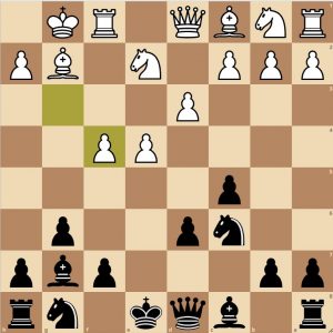 7… exf4 8. gxf4 (Stelling 2) Sven: de computer vindt het meer solide om met de loper of het paard te slaan. Desondanks houd ik wel van deze stelling met veel pionnendruk op het centrum en het vertrouwen dat ik die open g-lijn later kan benutten. 8… Lg4 9. c3 David: Na 9. h3 wilde ik 9… Lxe2 spelen, (9. h3 Lxe2 10. Dxe2 Pd4 11. Df2 f5 12. c3 Pc6). De computer vindt het maar niks, misschien wel omdat het veel tempi kost en wit flink voor komt in ontwikkeling. Sven verhinderde het plan met de sowieso nuttige zet 9. c3.